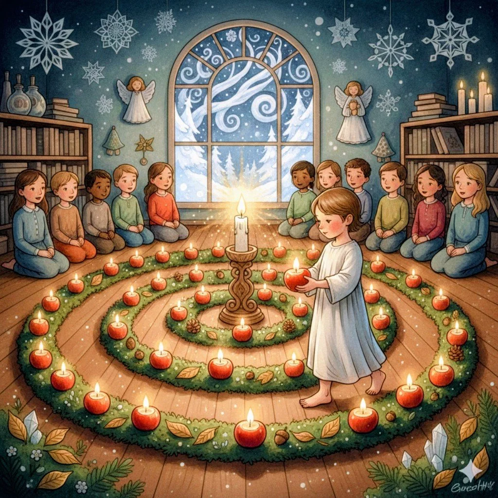Imagine a path laid out in a gentle spiral on the ground. It is often created with evergreen boughs, like fir, or pine, hinting at life and resilience even in winter. In the centre of the spiral a single candle stands lit. Along the path simple natural treasures might be placed: a smooth stone, a fallen leaf.