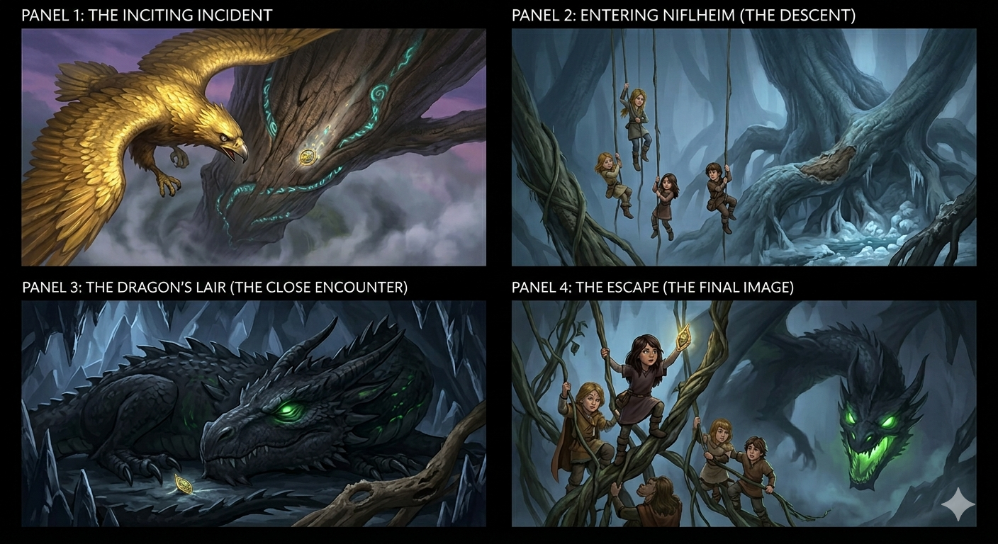 In our final project of the term, four brave adventurers—Hope, George, Nuala, and Frida—embark on a perilous journey into the twisting roots of the world. Their mission? To infiltrate the lair of the dreaded dragon Nidhogg and retrieve a lost magical amulet of immense power.